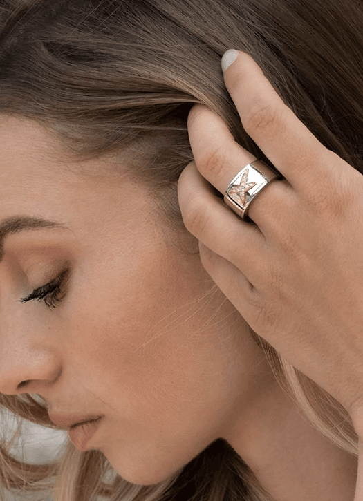 Mauboussin’s signature star takes on a freer, elongated shape in this contemporary design. The Envie de Star ring plays on contrasts: sterling silver meets a yellow-gold star pavé-set with white diamonds. A magnetic duo.
