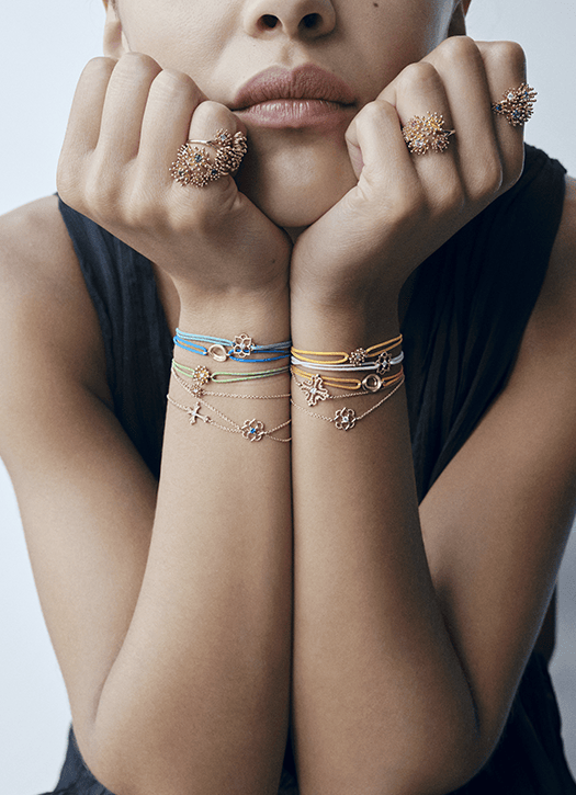 Launched in 2023, Gemmyo’s Entaille solar motif has quickly become a signature. Hand-sculpted by French artisans, it captures light through an inner diamond-set halo. In yellow, rose, or white gold, the Entaille Rayons S Pavé bracelet brings effortless radiance to the wrist.