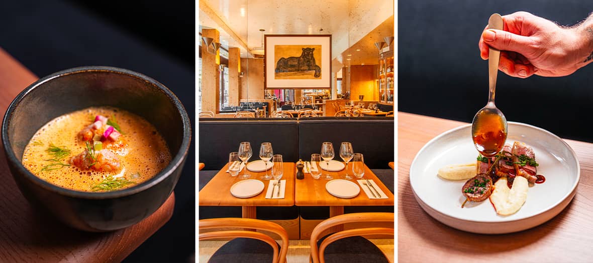 What do we eat? Wonders of small plates navigating the spheres of haute cuisine, crafted by chef Yohann Clotz, who trained at Cristal Room Baccarat and Apicius. At L’Atelier d’André, he has designed a menu based on three themes: Land, Sea, and Plant. The idea? Treat yourself to a four-course menu by picking freely from the menu (€49) or let the chef surprise you with a six-course menu (€69, with wine pairings + €46). We loved: rosé Paris mushrooms with soy-cured egg – small-catch cod, leeks, and soy – veal tartare with turmeric and ginger – wagyu beef, kimchi cabbage, and miso jus. Mind-blowing: the "œuf toqué" capturing an airy Reblochon mousse. And for the grand finale, an amazing honey and fromage blanc cream with its fleur de sel biscuit.