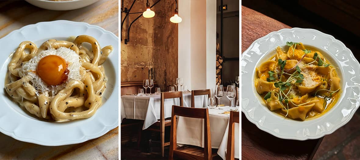 At the corner of rue de Poitou and rue Charlot, Carboni’s offers a little taste of Italy without leaving Paris. Behind its cream-colored façade, white tablecloths, wooden furniture and imperfect walls create an atmosphere that is both raw and deeply elegant. This philosophy also appears on the plate, with comforting Italian classics that are simple yet beautifully executed. Green olives from Puglia (€6) and sourdough focaccia with ricotta di buffala (€13) mark the beginning of the journey. Then come the stars of the menu: the famous pici cacio e pepe with soy-marinated egg (€29), which you’ve probably already seen on Instagram and which are just as delicious as they are photogenic. For dessert, there’s only one option: the iconic Italian tiramisù (€14). The highlight ? Heading downstairs to the Bar Sotto, a hidden speakeasy in a small vaulted cellar. Here, a vinyl jukebox lets you enjoy your cocktail with music in a vintage and intimate atmosphere.