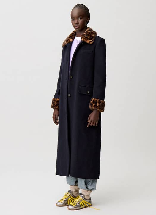 At Claudie Pierlot, boldness is key. Faux fur appears subtly on the collar, the leopard print is perfectly balanced, and the long cut structures the look. Three strong trends combined into one coat, designed for those who like to stand out — without overdoing it.