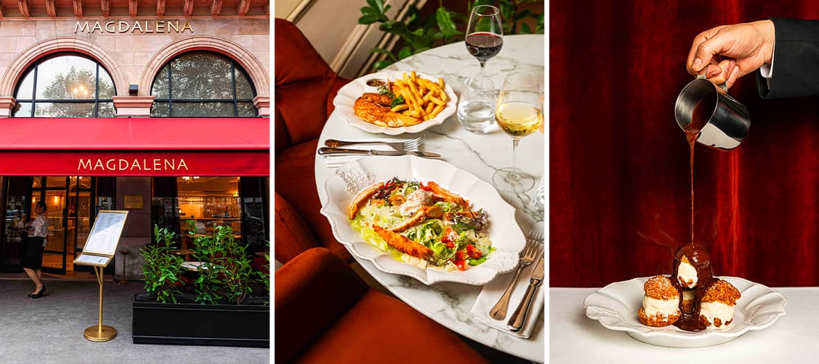 Inside the walls: In the former location of the mythical Café Pouchkine facing the Madeleine Church, Magdalena delivers bourgeois cuisine in a wildly Parisian decor, all marble and . After the bar, a proud staircase leads to a large upstairs dining room with a breathtaking view of the majestic monument, hosting wild weekend nights with DJ sets and beautiful people. Great for groups: at the very back, upstairs, a private lounge allows booking a discreet corner for up to 18 people with its own kitchen.