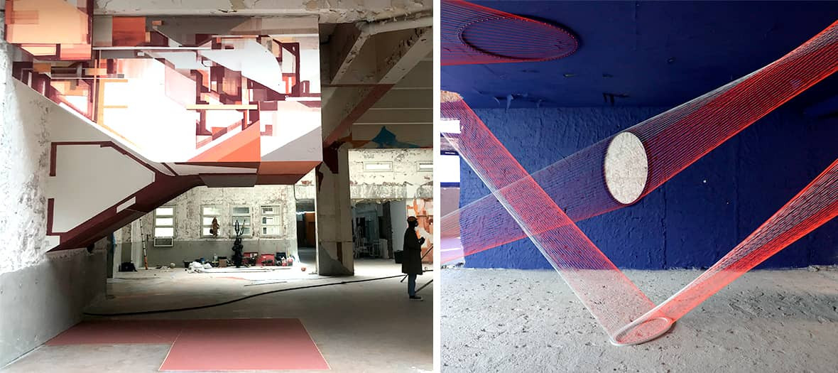 Everyone has played the game: consistency is essential between the works which respond to each other like that of Swiz who came to embrace the formwork of the staircase with Sowat's calligraphy on the beams and Tanc's unicolour composition. Or the Rero climbing wall and the green stained glass windows signed Ox; the suspended canvases by Rouge Hartley which unveils the collapsed wall by Ella & Pitr , a masterpiece, or the sculpture by Cécile Bonduelle which communicates between the two floors.