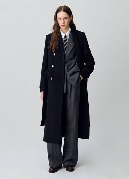 Our ultimate crush ? This black double-breasted coat by Claudie Pierlot, with a kimono collar, belt, and gold buttons. Simple in cut yet commanding in attitude, it’s the piece that instantly boosts your confidence. Picture it with loafers, a loose shirt, and a full suit for an empowered businesswoman look.