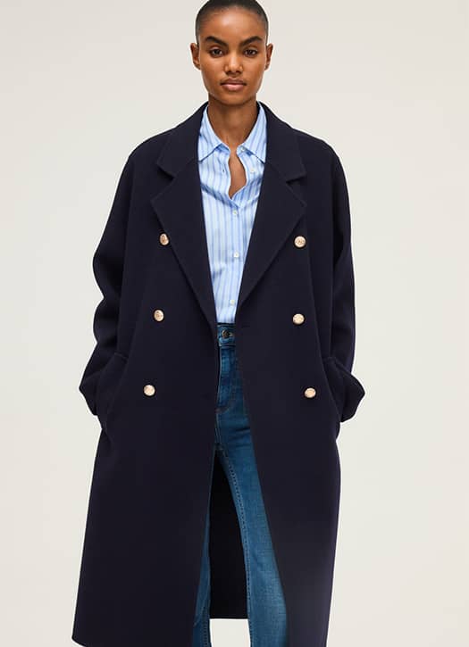 Instant crush on this double-breasted coat spotted at Pablo. Elegant without trying too hard, it’s the piece you’ll wear to the office, for a stroll through Paris, or even on a spontaneous date. Crafted in fine navy wool, with gold buttons and a tailored collar, it reinterprets the codes of the military coat with irresistibly chic city flair.