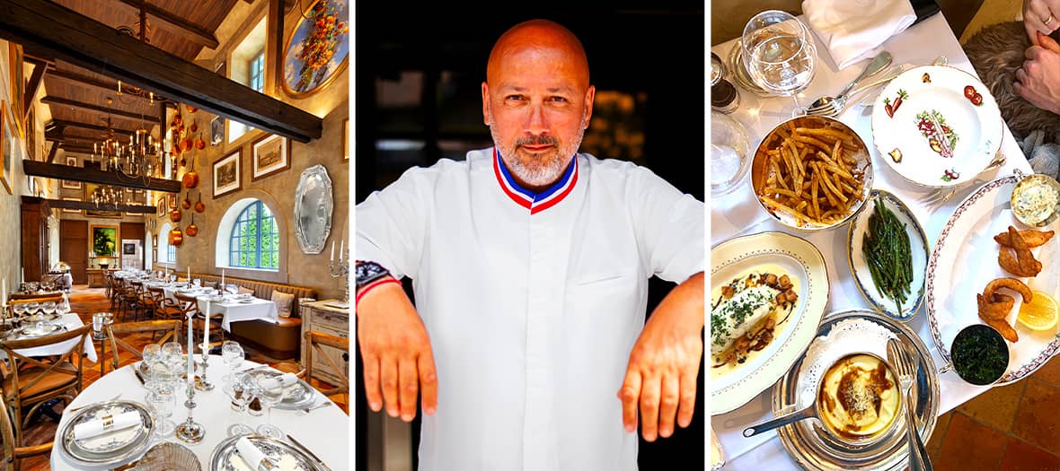 "I've been dreaming of this project for thirty years!" Frédéric Anton whispers to us. Close your eyes and imagine this former yellow dairy with blue half-timbering. Inside, toile de Jouy wallpaper, copper pans on the walls, hunting scene paintings, and framed old menus from La Ferme du Pré Catelan dating back to 1908, 1911, or 1949, hinting at the culinary direction. On the tables with tablecloths are silverware pieces unearthed from the archives of Le Pré Catelan, along with charming floral plates handpicked by the chef himself. Surrounding the place, nature, and the feeling of having driven hours to find yourself in the countryside. Our recommendation? Plan for a quick taxi ride to reach this paradise deep within the Bois de Boulogne ! It's totally worth it.