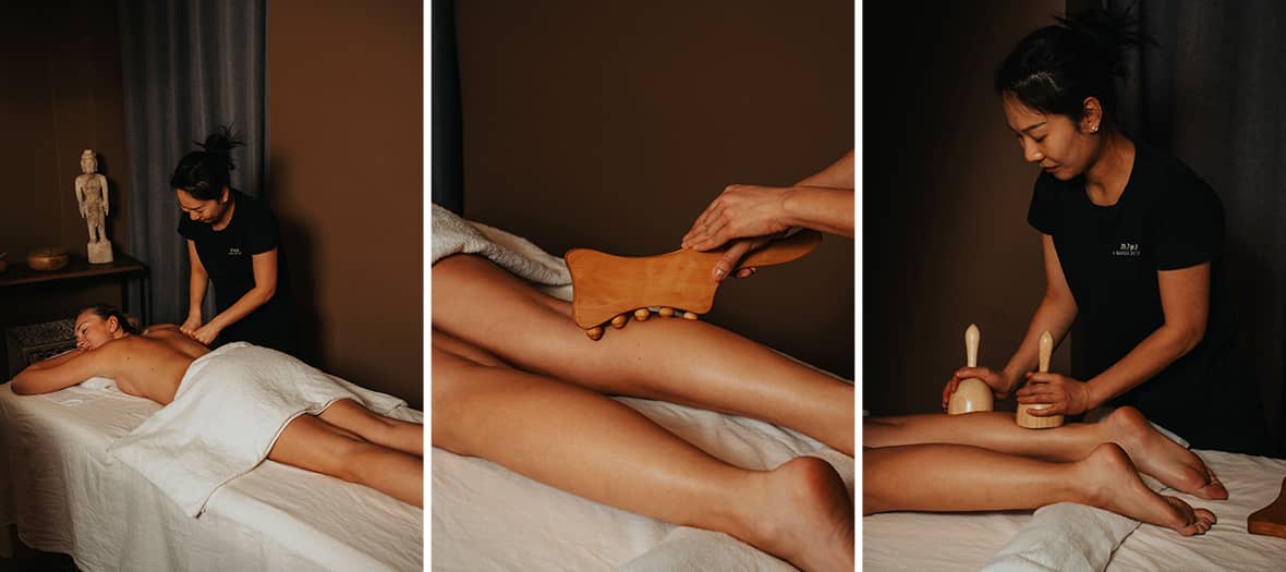 The protocol: The session begins with gentle stretches to prepare the body, release tension, and improve mobility. A lymphatic drainage massage follows to stimulate toxin elimination. The treatment continues on the legs, stomach, and arms with firm movements to boost circulation. Then come traditional tools: a Chinese comb to work deeper and stimulate flow, and wooden cups to sculpt the body and enhance drainage—without pain. The session ends with softer gestures and acupressure points to prolong the benefits.