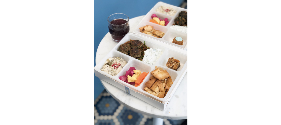 On the platter: a delicious taboulé with peppers, a very nice cucumber tzatzik, smoked eggplant caviar, house pickles, crunchy pita chips with sumac to dip, beef and veal meat balls replaced by falafels in the veggie option, and one of the famous house deserts. Example ? A stunning biscuit in filo dough and Piedmont nuts or a crunchy nest made with angel hair and orange blossom.