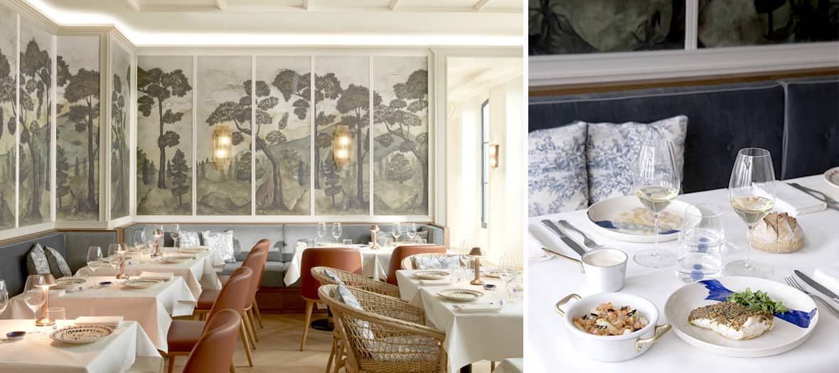 This extraordinary 18th-century private mansion was built for the steward of King Louis XV's Menus Plaisirs and hosted some of the most sought-after parties in Paris. The tour begins with the rooms, whose Haussmann-inspired simplicity (the combination of parquet flooring, fireplace, and moldings always has a great effect) is enhanced by green velvet contrasting with shades of beige. It must be said that for the decor, Catalan architect Lázaro Rosa Violán went all out, managing to harmonize Parisian codes with his colorful palette, which is particularly evident in the grand restaurant and bar.