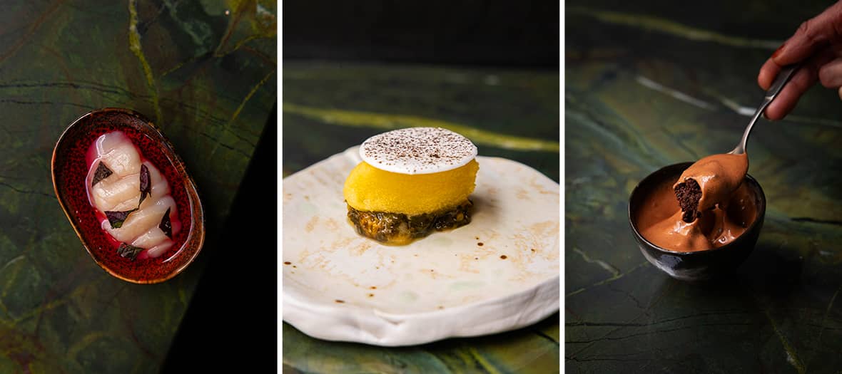 All eyes are then drawn to the fully open kitchen, allowing guests to admire the chefs at work. The best seat in the house ? The majestic green marble counter, offering a front-row view of the action. Attention to detail extends all the way to the tableware: each plate has been carefully selected, some even custom-made, to enhance every dish down to the finest detail. More than a meal, Mantra is a timeless experience : an invitation to travel and to contemplate every gesture, like a living culinary performance.