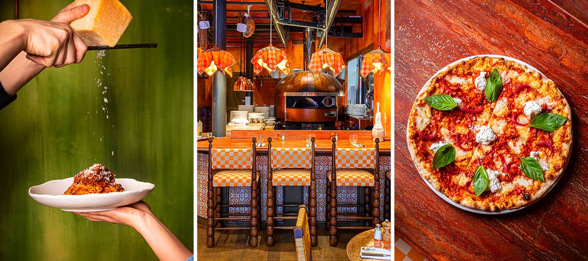 The place: We immediately love the chic orange decor, reminiscent of diving into a Spritz. Right at the entrance, a pizza oven sets the tone and spreads mouthwatering aromas while showcasing the pizzaiolo in action. Upstairs, a gorgeous room with green accents features striped banquettes, floral wallpaper, and a bar ready to shake up cocktails (try the Zapi Spritz with orange bitter and elderflower liqueur, €13).
