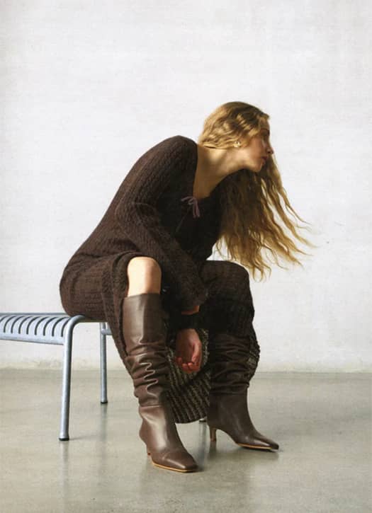 The time when we pulled our boots to avoid the slightest fold is over! We love the pleated effect, the small heel and the pointed toe of this pair signed Alohas, whose shoe boutique is lifting the Marais. We love its magnificent durable chocolate leather, to wear with a long ivory knit skirt.