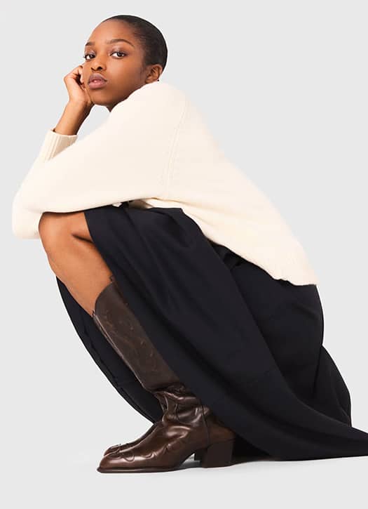 The essential pair, it’s the one that we put on without thinking and that always makes the difference. At Sézane, we found these mid-high boots in glazed black leather which will become your ideal partner in crime, because they match with everything! They will follow you all day long: at the office with 2000’s effect skinny jeans, at the restaurant with fitted trousers and a slightly sexy top, and even in the evening with a very mini dress.