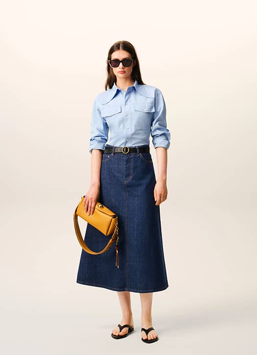 During its latest runway show, Courrèges imagined every step of a city dweller’s day, from morning to evening. In the same spirit, we love the indigo raw denim midi skirt by AMI Paris. Its slightly flared cut structures the silhouette while remaining easy to wear at the office. Pair it with an oversized shirt tucked into the skirt for a chic yet relaxed look.