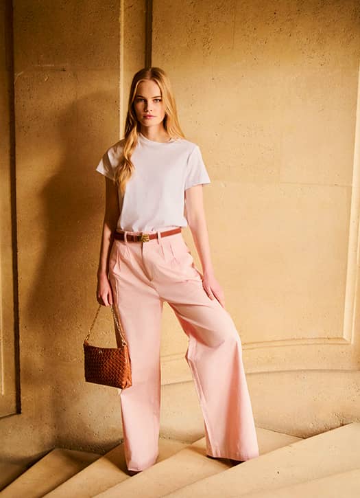 Color doesn’t only belong on top. What better way to brighten an office outfit than with pink trousers? At Petite Mendigote, we love this oversized style with a wide cut and slightly high waist, both comfortable and elegant. Pair it simply with a white T-shirt and a belt to structure the silhouette. The result: an easy outfit where the trousers do all the work.