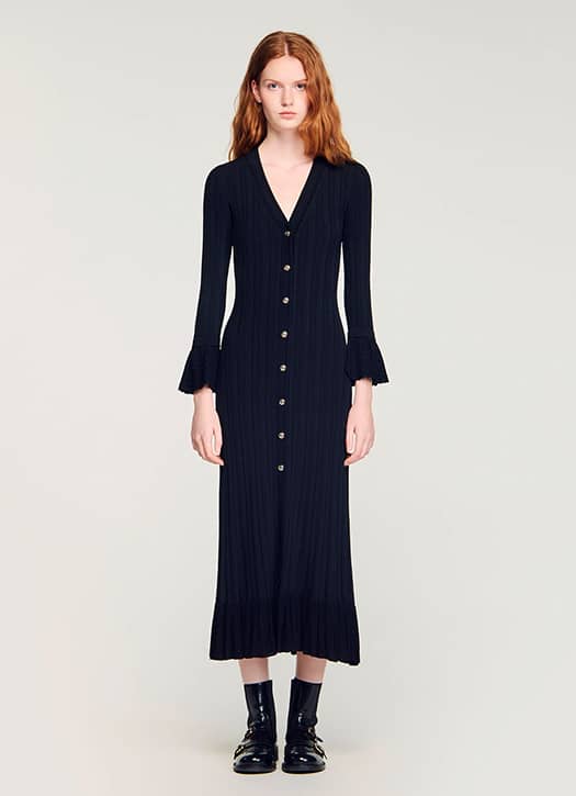 The knit dress is often overlooked, yet it’s perfect for creating a simple and elegant outfit. At Sandro, we love this navy knit dress, long enough to show off a pair of stylish shoes. V-neckline, gold buttons along the front… but the real standout detail is the wide ruffled sleeves, which instantly give the piece character.