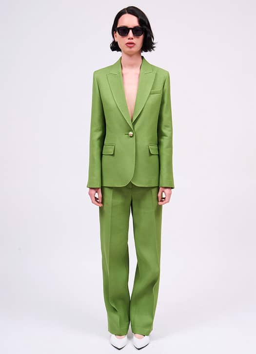 In its spring-summer collection, Paul & Joe revisits the tailored suit with just the right amount of energy. The cut remains structured and straight, avoiding the oversized trend: well-cut trousers and a structured blazer that return to classic tailoring. The twist? A vibrant green shade, spotted everywhere during Fashion Week, bringing freshness while remaining elegant. A detail we love: the daisy button, subtle but charming.