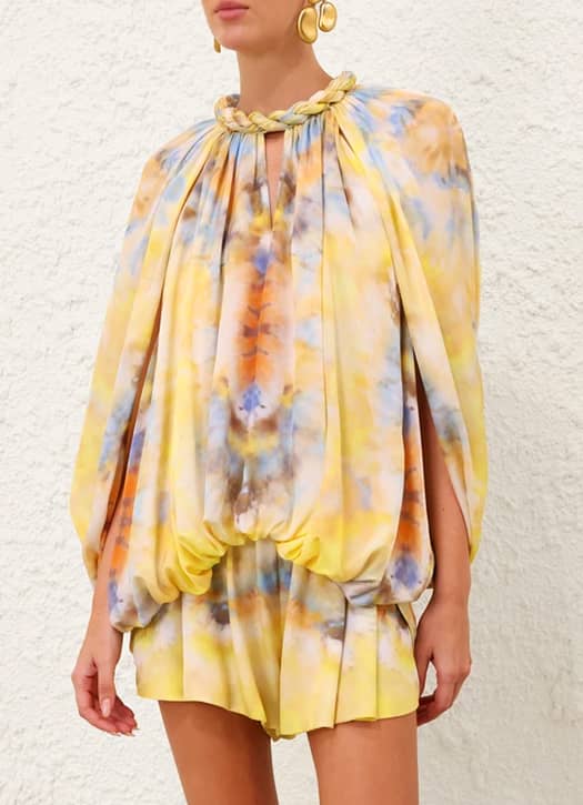 This is the wedding you’ve had marked since 2024. The one you’re going all in for. At Zimmermann, go for a look as bold as it is elegant: a silk blouse with a V-neckline, trimmed with braided details, long puffed sleeves, paired with matching mini shorts. All in a bright lemon tie and dye that enhances the legs—especially with pointed heels. Result: a strong look and the certainty no one else will wear the same outfit.