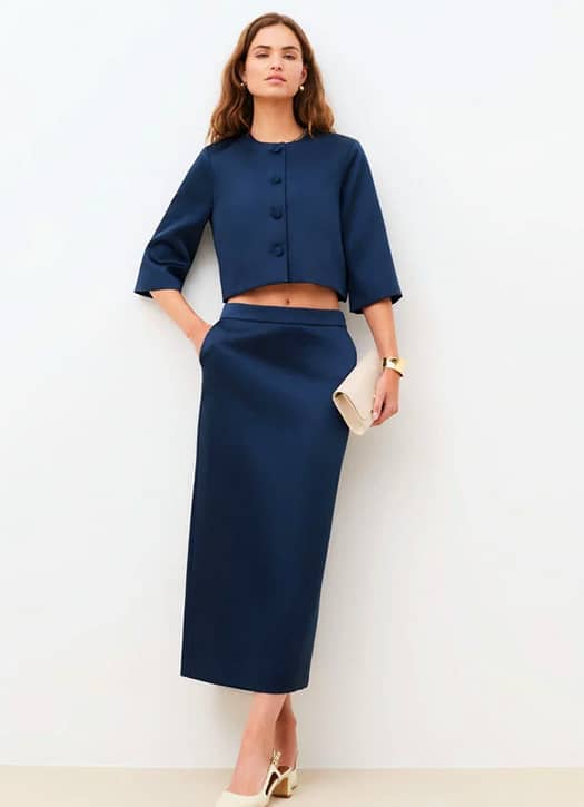 Looking for a more classic look, Jackie Kennedy style, 2026 version? Caroll offers a decidedly chic set composed of a three-quarter sleeve shirt, slightly cropped, and a long skirt with a back slit. All in an elegant navy blue, perfect for a civil ceremony. And to complete the look: a well-chosen headband. Bonus: the whole outfit comes at a very reasonable price.