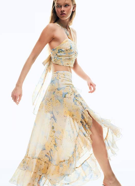 Dress code: countryside chic! H&M shows how to embrace it without falling into clichés. Here, the outfit includes an asymmetrical tulle skirt and a light crepe crop top with floral prints that are present but never overwhelming. No more overly bold flowers saturating photos: instead, a soft palette of pale yellow, blue, and vintage green. A silhouette that feels straight out of a Jacquemus show.