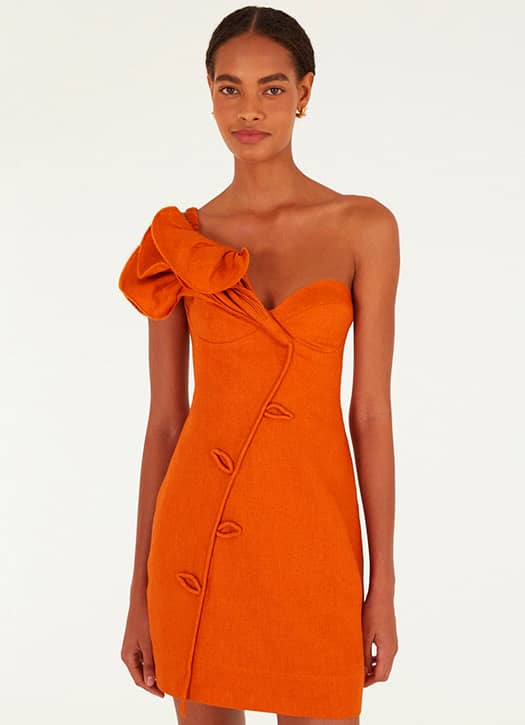 A wedding under the sign of color? No problem. Head to Farm Rio, the Brazilian brand that always delivers the sunniest summer looks. Here, an orange linen mini dress with a bustier twisted by an asymmetrical shoulder, all highlighted by a flower running along the silhouette. The kind of piece that calls for a sun-kissed glow to bring out all its vitamin D.