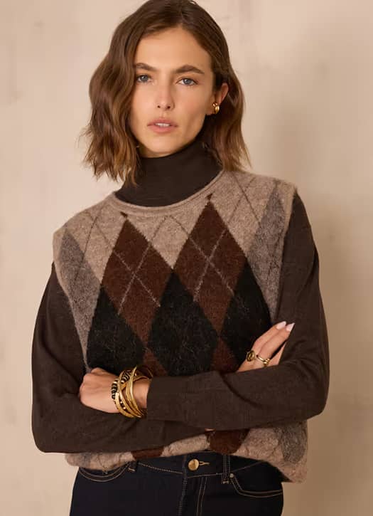 We spotted the perfect sleeveless sweater at Maison 123. Their knit collection stole our hearts, especially this warm (but breathable) wool–alpaca blend with seasonal argyle diamonds. A piece you’ll wear nonstop over a white shirt, a turtleneck, or even a long-sleeve tee.