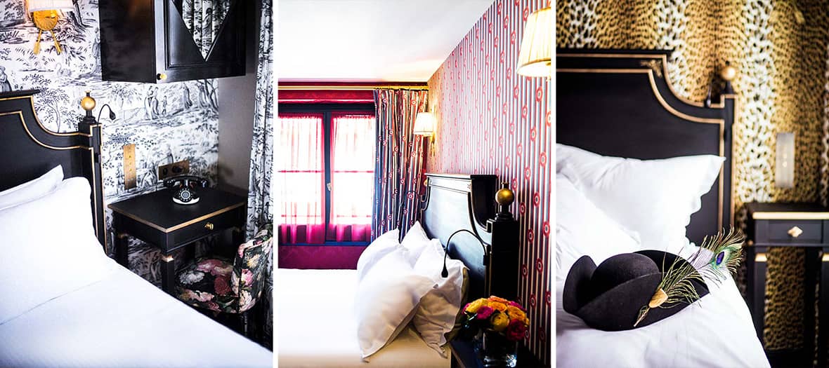 Located near musée Carnavalet in the heart of Le Marais, Le JoBo pays tribute to Empress Joséphine. Interior designer Bambi Sloan drew inspiration from the flamboyant style of the First Empire. Housed in a former 17th-century convent, the hotel is filled with Empire symbols: a Directoire-style lounge bar, leopard prints (a nod to Joséphine’s famous leopard, rug), roses — her favorite flowers — and furniture inspired by her era. The 24 rooms feature reissued historic wallpapers such as La Cocarde, Roses et Dentelles, and La Folie Monceau, alongside swan-neck furniture and parquet-effect carpets. Standout rooms include 405 with black-and-white toile de Jouy walls and 105 with bold leopard print decor. There is no restaurant, but the elegant lounge bar serves wines, champagne, cocktails, and gourmet plates including charcuterie, aged cheeses, and Noir de Bigorre ham.