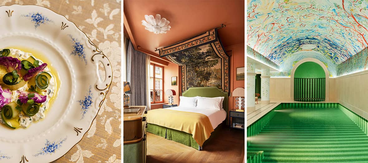 Located steps from rue de Rivoli and Hôtel de Ville, Le Grand Mazarin is the first urban hotel by Maisons Pariente — and it stands out with its exuberant, colorful interior design by Swedish architect Martin Brudnizki. Across 61 rooms (including 11 suites), classic elements such as canopy beds, silk lampshades, herringbone parquet floors, and Lucien Gau rugs meet a bold rainbow palette. Bathrooms are equally vibrant. The Boubalé restaurant celebrates Mediterranean flavors infused with Levantine and Turkish spices. The hotel’s spectacular spa features a 17-meter mosaic-tiled pool crowned by a fresco by Jacques Merle, alongside a hot tub, hammam, fitness room, and treatment cabin. For evening drinks, head to Le Petit Bazar, the stylish underground bar known for its curated playlist.