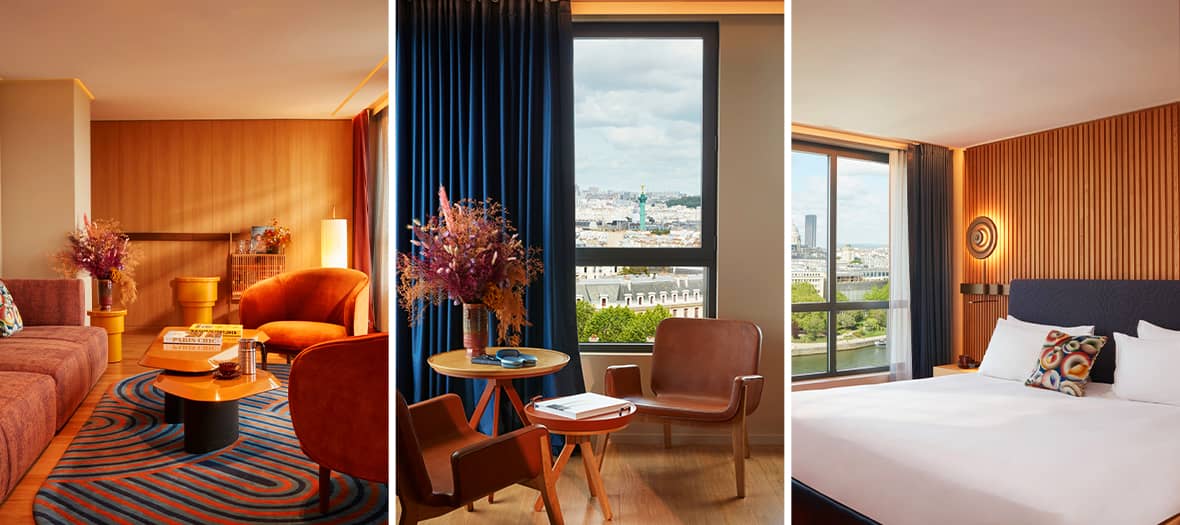 Located on the banks of the Seine, SO/ Paris, inaugurated in 2022, makes a bold statement. This first French flagship of the SO/ collection by Ennismore (The Hoxton, 25hours, Mama Shelter, Mondrian…) features 162 rooms and suites spread between the 7th and 14th floors of a former administrative building. The interiors contrast beautifully with the building’s austere exterior. With a subtle 60s-inspired design, rooms offer generous spaces ranging from 43 to 57 sqm, up to 128 sqm for the spectacular SO Paris Suite on the 14th floor, boasting breathtaking views over the capital. Decorated in shades of blue enhanced with yellow and coral accents, the rooms are both elegant and vibrant. For the ultimate experience, book one of the Collection rooms overlooking the Seine and Paris landmarks. Even better ? The Atelier Suites, inspired by Montmartre artist studios, overlooking the rooftops of Paris. The hotel also features a 24/7 fitness center on the 7th floor with a 20-meter swimming pool, state-of-the-art equipment, and a spa by Maison Codage with two treatment rooms — making it one of the most beautiful hotels in Paris 4th arrondissement.