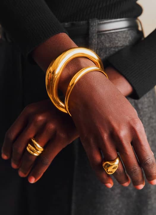 The era of thin, discreet bracelets is officially over. Enter the age of XXL jewelry and bold bracelet stacking—the art of wearing multiple bracelets without hesitation. This Sézane brass bracelet checks all the boxes. Worn over long sleeves or directly on bare skin, it instantly elevates any outfit.