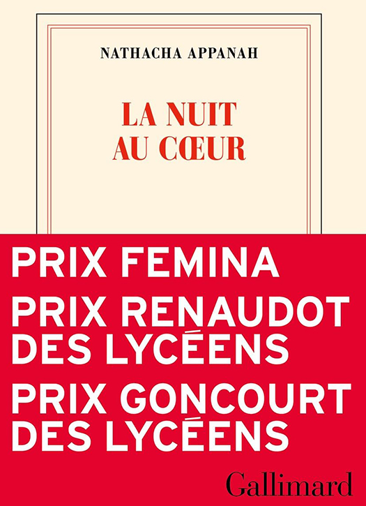 The must-read: La nuit au cœur by Nathacha Appanah, Prix Goncourt des lycéens, Prix Renaudot des lycéens, Femina.