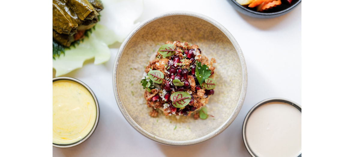 To be enjoyed solo of to share with neighbours: sexy and very contemporary dishes, such as the incredible vetetalshawarma(flower of celery, white sauce blanche, pickles and grilled veggies) or the traditional saladieh, an incredible cod with a tajine sauce served with pilaf rice.