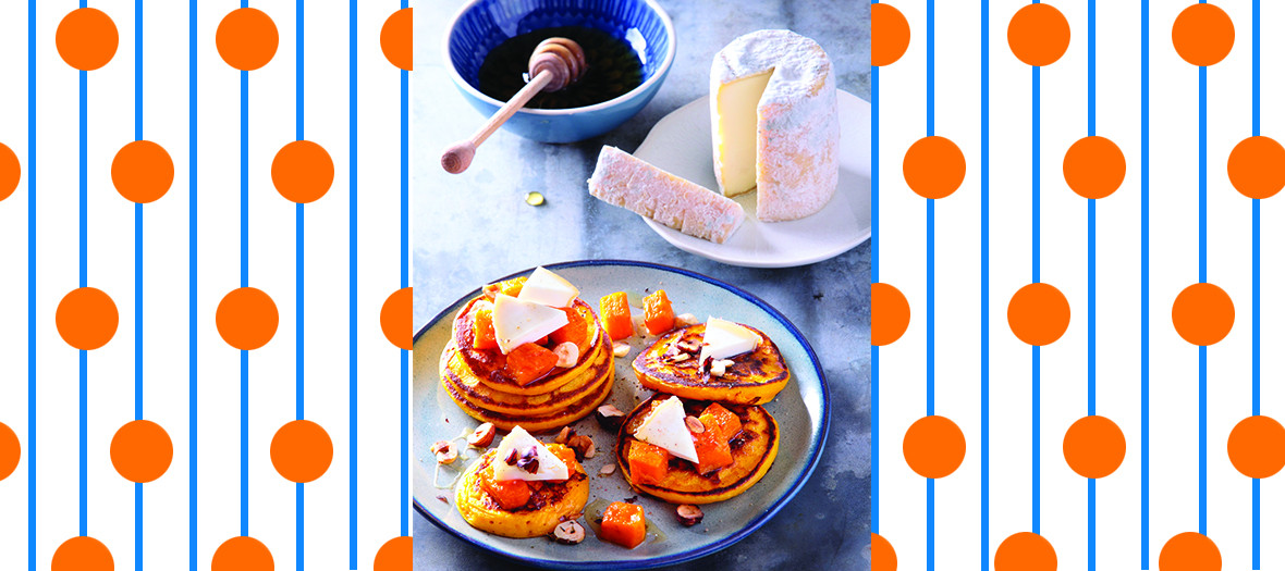Then place squares of butternut on each pancake, add a quarter of Charolais AOP cheese, roasted hazelnuts and honey.