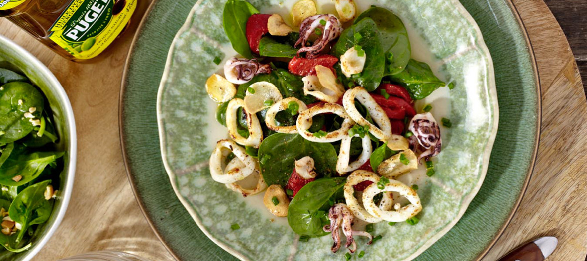 4/ Cut the calamari in 1-cm rings. In a warm pan, pour two spoons of Puget Classique olive oil and cook quickly.