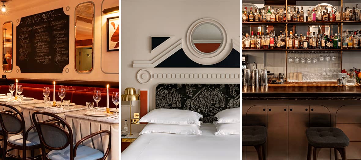 In the ultra-trendy Covent Garden district, the Experimental Group opened Henrietta in 2017, combining two typically English buildings dating from 1874 and 1887. Designed by Dorothée Meilichzon, this 4-star boutique hotel blends 21st-century design with a 1970s aesthetic across its common areas and 18 individually styled rooms. Expect statement headboards with round mirrors, colorful walls, marble skirting topped with bold bands of color, velvet armchairs and brass lamps, creating an ultra-cosy feel. The playful pink bathrooms delightfully defy minimalist codes. The entrance reveals a cosy lounge with velvet banquettes and terracotta floor tiles. Following its success, 22 additional rooms opened in September 2021 in a house just opposite. The ground-floor restaurant, Henri, offers a joyful ambiance with contemporary décor : long banquettes, wood paneling, pale blues contrasting with deep greens, rich burgundy tones and marble accents. British chef Jackson Boxer crafts a culinary journey celebrating iconic Parisian bistros while honoring seasonal British cuisine.