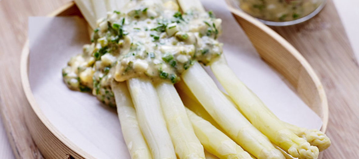 Chop the capers, the pickles, the hard boiled eggs and the aromatic herbs. In a salad bowl, make your own gribiche sauce: whip the mustard and the vinegar, season with salt and pepper. Pour a little peanut oil. When the sauce is firm and thick, incorporate the shredded eggs and herbs. Place the asparagus on a plate and garnish the small compartment with gribiche sauce.