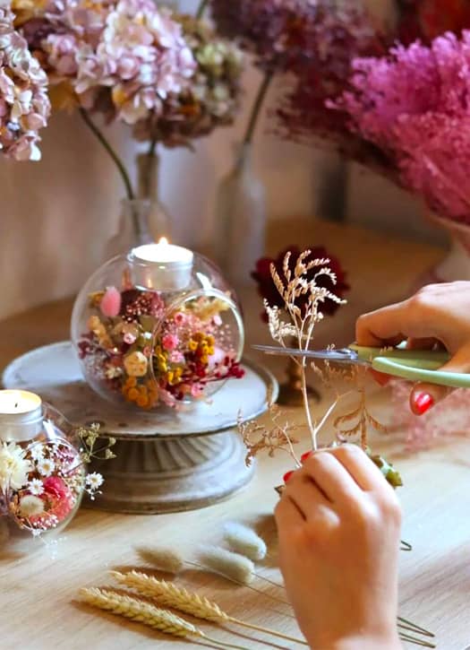 Pour se donner un petit shot de printemps, on plonge dans l'univers apaisant de l'art floral afin de concevoir un bougeoir de fleurs séchées. On se laisse porter et on choisit ses fleurs séchées préférées pour donner vie à son bougeoir. C'est un vrai travail artistique : la fleuriste Mimi enseigne l’art de combiner les couleurs et les textures, tout en maniant des outils spécifiques comme un sécateur. On repart avec son bougeoir : une adorable pièce de déco pour mettre de la couleur dans son intérieur !