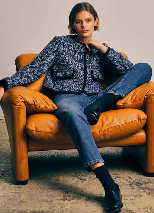Repérée chez Pablo, la petite sœur chic de Gerard Darel, cette veste en tweed à motif chevrons affiche une coupe droite impeccable, un col rond élégant et des boutons bijoux qui font toute la différence. Une pièce facile à styliser et qui apporte immédiatement du caractère. On l’imagine avec un bermuda en denim foncé et des bottes hautes pour un look pointu digne des it-girls d’Insta.