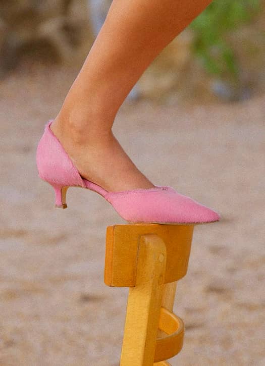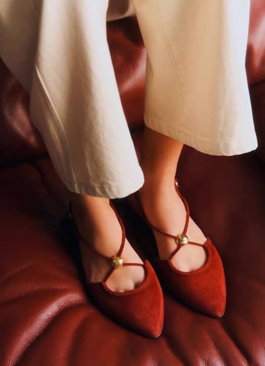 La ballerine, on l’a bien compris, ne compte pas quitter notre dressing de sitôt après son retour fracassant l’année dernière. Chez Sézane, elle se réinvente en version pointue, sling-back, en fine suédine terracotta. Une silhouette plus affirmée, loin du classique un peu sage. Avec une tenue full white et une peau qui commence à se hâler, l’allure fonctionne immédiatement.