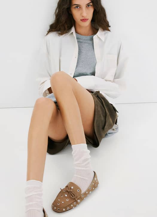 Le mocassin est sûrement la paire qui se twiste le plus et s’adapte à tous les styles de façon effortless. Chez Mango, on le retrouve en suédine grise avec des œillets, dans une version diaboliquement tendance. Parfait pour casser un look trop sage, tout en gardant ce côté chic qu’on aime.