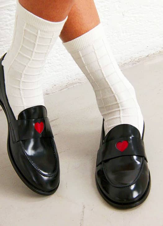 Impossible de lâcher les mocassins, sûrement la paire la plus fiable du vestiaire avec laquelle on traverse les saisons. Dégotés chez Jonak, rehaussés d’un petit cœur rouge qui vient subtilement détourner leur classicisme, on porte ceux-ci avec des chaussettes et une minijupe pour une silhouette de classic girl en version beaucoup plus cool.