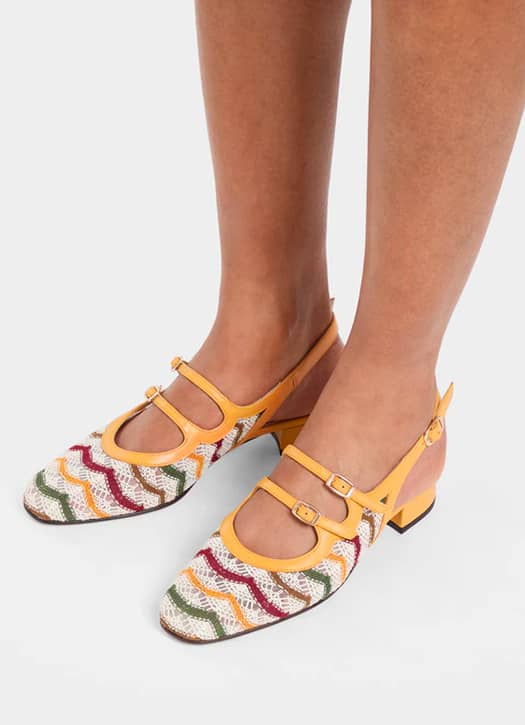 Carel prend depuis quelque temps un virage plus audacieux, entre collaborations et nouveaux modèles qui bousculent ses codes. Ces slingbacks en cuir verni jaune en sont la preuve : une base iconique, twistée par un crochet rouge, jaune et vert qui sent déjà les vacances. Une paire qui attire l’œil sans en faire trop, et qu’on imagine déjà portée avec un bermuda en jean et une chemise blanche. On a déjà hâte de les emmener fouler la French Riviera…
