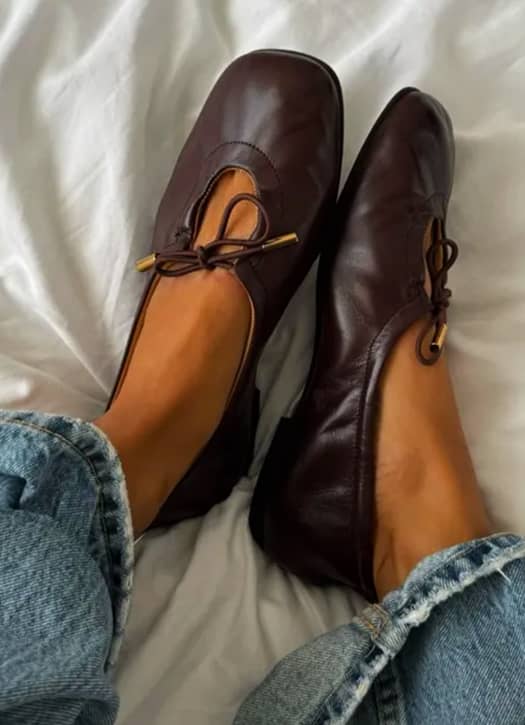 La ballerine se fait plus cool que jamais chez Alohas. Plus resserrée, teintée de bordeaux, elle gagne instantanément en allure et se porte avec des collants ton sur ton pour une silhouette allongée sans effort. Le détail qui change tout ? Une semelle souple qui les rend diablement confortables.