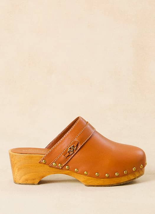 La saison dernière, Chloé avait annoncé le retour des sabots, et cette fois c’est confirmé : ils sont partout. Chez Petite Mendigote, on les retrouve en cuir caramel avec une semelle en bois cloutée. Une paire facile à porter avec une jupe longue bohème, quand les looks commencent à s’alléger. On est à deux doigts de réserver un billet pour Coachella juste pour les porter !