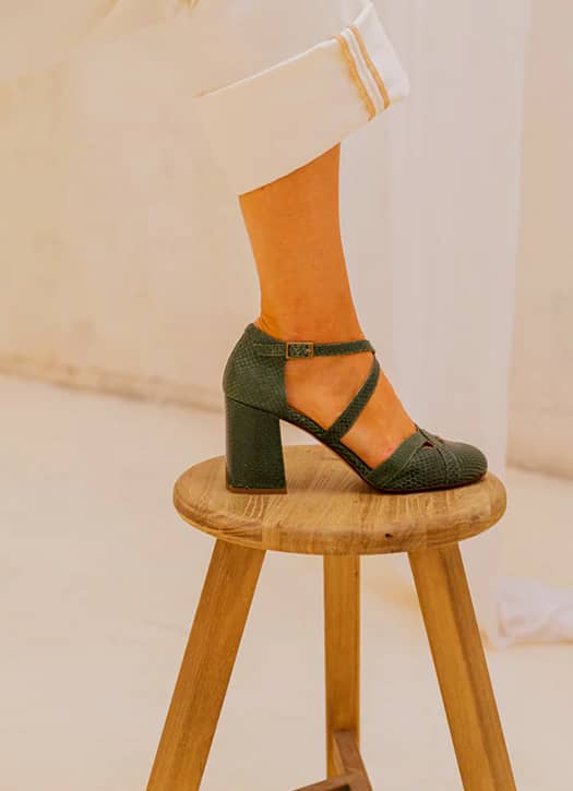 Nouvelle marque repérée, coup de cœur immédiat. Ganzitos, label espagnol, impose une vision très glamour pile dans la tendance. Le modèle Noa Botella coche toutes les cases : bout rond, talon carré, cuir effet python vert… une paire qui relève instantanément n’importe quel look, même le plus simple. Le vrai plus ? Un cuir souple et un confort absolu, signature de la marque, qui permettent de les porter toute la journée malgré ses 8 cm de talons.