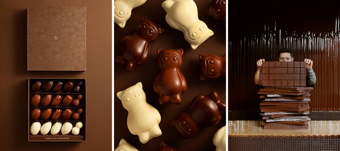 À croquer absolument : on a notamment adoré les incroyables orangettes présentées comme un fruit coupé en deux (35 € les 8 pièces), les bonbons pralinés pistache, coco, amande, cacahuète ou noisette (15 multi 50 €), les tablettes pralinées ou ganache (16 €) et l’incroyable pâte à tartiner chocolat noisette ou cacahuète (18 €). Inattendus mais furieusement addictifs : les cakes amande, marbré chocolat vanille, pâte de cacahuète, zestes de citron ou pâte de pistache (35 €). Le must à offrir ? Le Coffret Collection avec 12 variétés et 3 enrobages, tellement chic à poser sur la table (150 €). Ultime nouveauté qui promet de rester à la vente même après les fêtes pascales : le Cedrico de Pâques décliné aux chocolats noir, lait ou blanc et garni de guimauve vanille, croustillant praliné vanille fleur de sel (45 €). Irrésistible avec sa bouille et ses petites fesses !