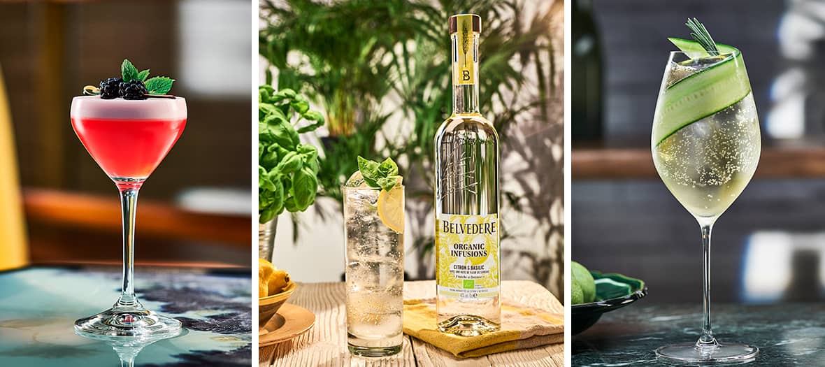 Le produit principal de ces cocktails ? Belvedere Organic Infusions, un spiritueux bio aux infusions de fruits et de plantes. Conformément aux réglementations locales de la Polish vodka qui mentionnent que “rien d’autre ne peut être ajouté", les vodkas Belvedere Organic Infusions sont sans additif et possèdent des saveurs distinctives, reconnaissables dès la première dégustation. Ça donne trois créations : Mûre et Citronnelle, Citron et Basilic, Poire et Gingembre.