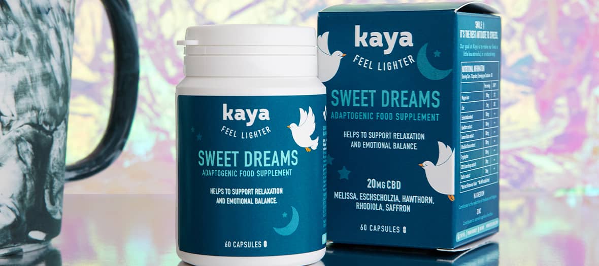 On aime : la cure Sweet Dreams de Kaya, 2 petites pilules à avaler pendant 1 mois avant de se coucher qui combinent des plantes adaptogènes (CBD + aubépine + mélisse + rhodiole + safran + eschscholtzia) boostées d’ingrédients comme le magnésium, le tryptophane et le zinc.