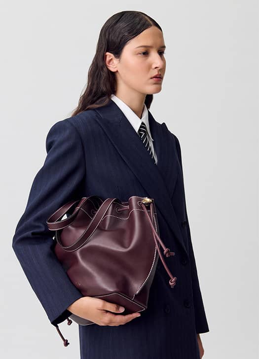 Décidément, le deux-en-un parfait de Claudie Pierlot s’impose comme l’un des it-bags de la saison, surtout décliné dans ce bordeaux profond : un cabas fourre-tout pour les journées bien remplies, dont on resserre les liens pour le transformer en sac seau plus cool et casual.