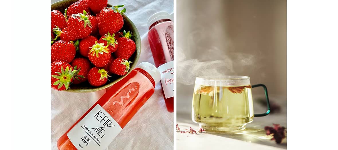 Le kéfir (boisson obtenue par la fermentation de grains de kéfir dans les jus de fruits), naturellement riche en probiotiques pour nourrir notre microbiote intestinal. Ma marque préférée ? Kefir and Me : une production artisanale de kéfir d'eau associé à des superaliments et des fruits de saison 100 % bio.